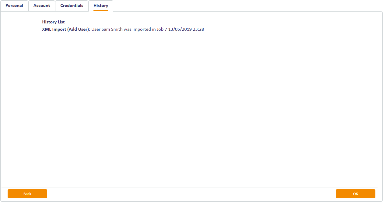 5. The Account, Credentials, and History tabs are the same as those used to view a person – see section 3.2.1, Viewing a person's details for details.