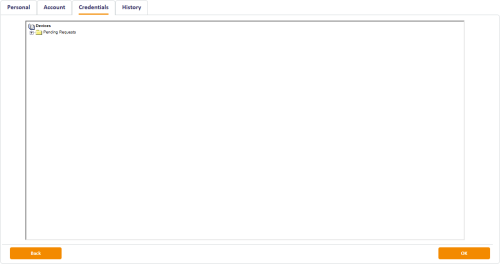 The Credentials tab displays information about all credentials related to the person's account; it displays pending requests and details of current credentials, including the history of each credential and information about the certificates it contains.