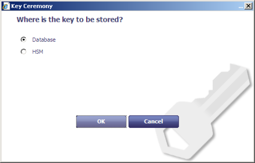 If you have installed support for an HSM, you are asked whether you want to store the key in the database or on the HSM.