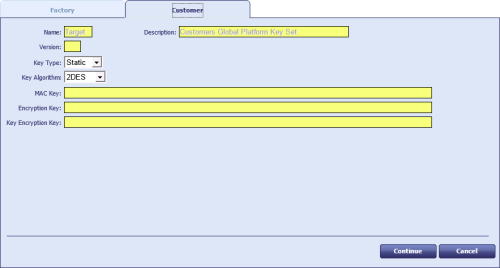 The Manage GlobalPlatform Keys workflow contains two pages – one for entering details of Customer keys and the other for Factory keys.