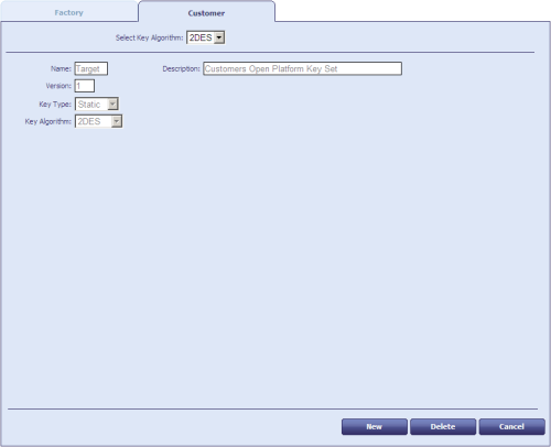 The Key Algorithm must match the secure channel used for the factory keys. If you are issuing multiple types of GlobalPlatform cards (or SIMs or other form factors) using secure channel types associated with different key algorithms, you need to configure multiple Customer GlobalPlatform keys. For example, you will need to configure 2DES GP customer key for those using the SCP01 channel type, and an AES128 for those using the OT-SCP03 channel type.