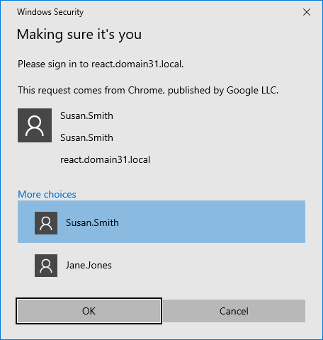 If your FIDO authenticator supports it, and has been issued with a discoverable key for the user and the domain (for example, by issuing using a credential profile that has the Require Client Side Discoverable Key option set) you can opt not to provide a username. If there is more than one identity for the current domain on the FIDO authenticator, the Windows Security dialog provides you with a list to select the appropriate one to use: