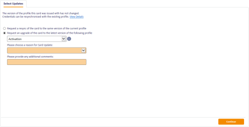 - Request an upgrade of the card to the latest version of the current profile – MyID will create an update job to upgrade the card to the latest version of its current profile. This option is available only if the credential profile has changed.