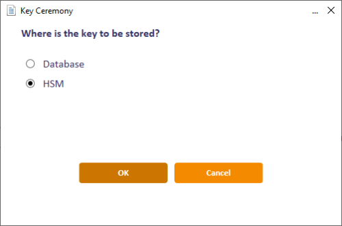 If you have installed support for an HSM, you are asked whether you want to store the key in the database or on the HSM.