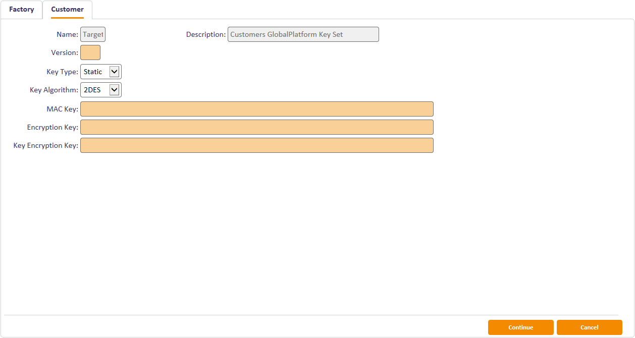 The Manage GlobalPlatform Keys workflow contains two pages – one for entering details of Customer keys and the other for Factory keys.