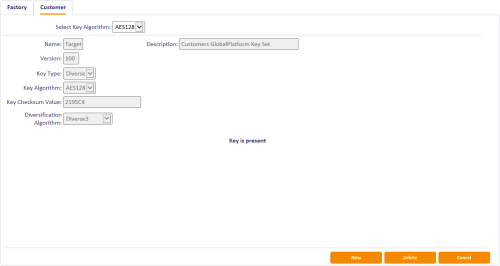 The Key Algorithm must match the secure channel used for the factory keys. If you are issuing multiple types of GlobalPlatform cards (or SIMs or other form factors) using secure channel types associated with different key algorithms, you need to configure multiple Customer GlobalPlatform keys. For example, you will need to configure 2DES GP customer key for those using the SCP01 channel type, and an AES128 for those using the OT-SCP03 channel type.