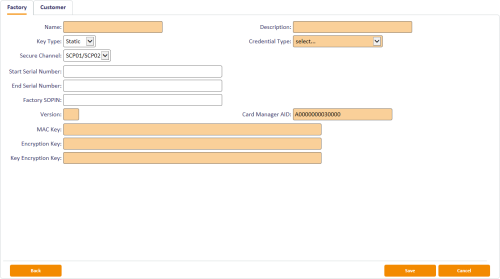 - Note: You can define multiple sets of factory keys – if one already exists, click New to create a new set. If multiple factory keys are defined for the same credential, the most recently entered factory key will take precedence.