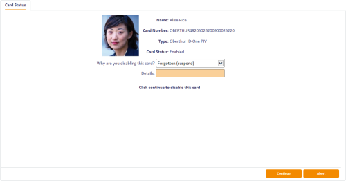 You can enable or disable a card temporarily using the Enable / Disable Card workflow. You can enable or disable the card whether the card is present or not.