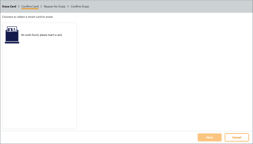 Note: If your card is contactless only, or it is not present, you cannot use the Erase Card workflow to cancel it. Instead, use the Cancel Credential workflow. See section 5.11.3, Canceling a credential.