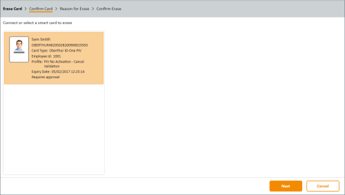 If the credential profile used to issue the card had the Validate Cancellation option selected, you must obtain the approval of another operator before you can erase the card.