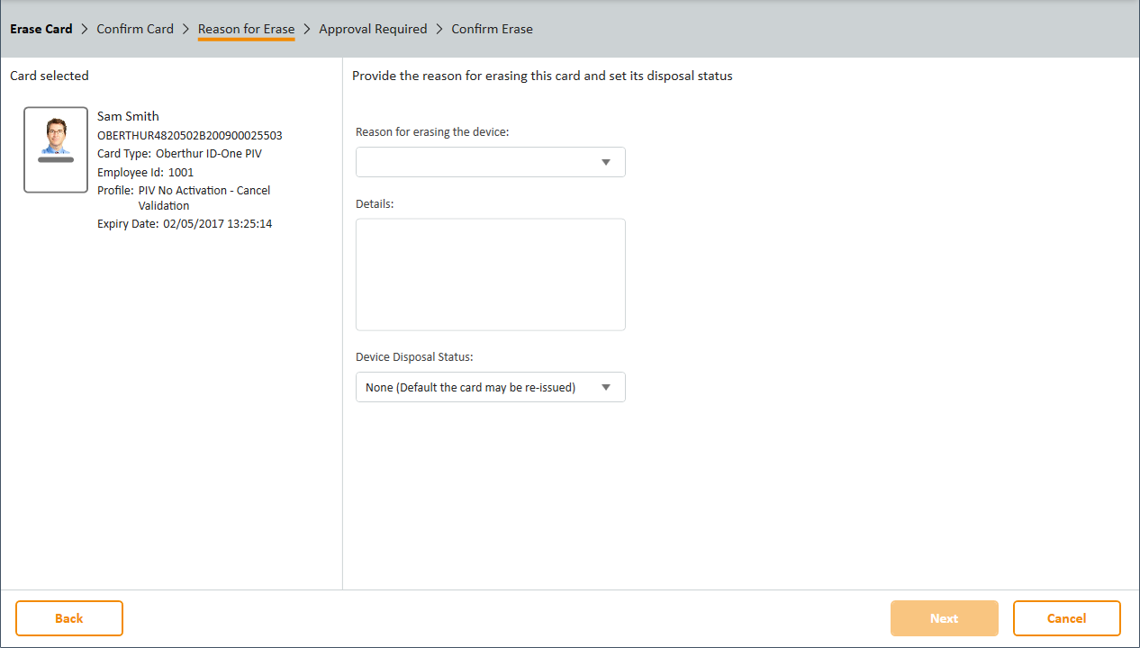 - Details – type further information on your reasons for erasing the card. This information is stored in the audit record.