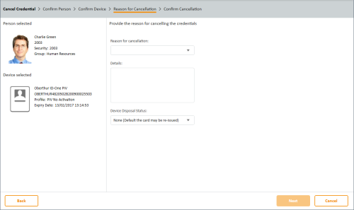 Device Disposal Status – select what you want to happen to the physical credential after cancellation. For example, you may want to prevent the credential from being used again within MyID.