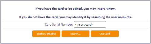If the card is not present, click Search then use the Find Person screen to find the cardholder, then (if the cardholder has more than one card) select the card you want to enable or disable.