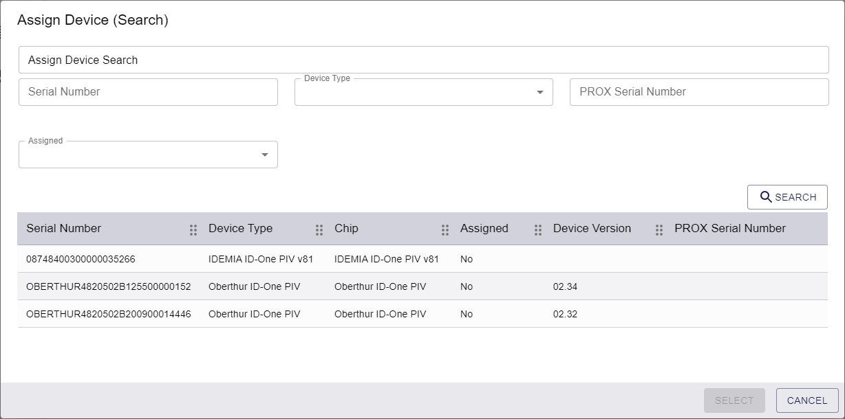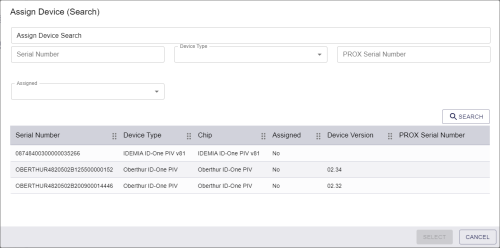 The device you select must be suitable for collection; it cannot be at a status of Lost or Disposed, and it must be of the correct type (for example, Contact Chip or Contactless) for the credential profile. You can assign devices that have already been assigned only if the Unrestricted Cancellation option is set in the credential profile; in this case, when you assign the device to the current request, any previous request that had the same device assigned is canceled. Similarly, if the device has already been issued, when you assign the device to the current request, the previously-issued device is canceled.