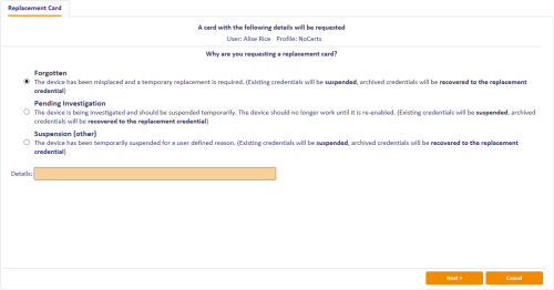 For temporary replacement cards, you are strongly recommended to set up a temporary replacement credential profile, to consider carefully who can receive the temporary card, to restrict its lifetime, and consider which certificates you want to include on it. If you do not specify a temporary replacement credential profile, the original credential profile is used instead – this may not be appropriate for your security policies.