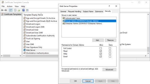 Additionally, the logged-on user must have Read, Write, and Enroll permissions for the Web Server certificate template on the Microsoft Certification Authority.