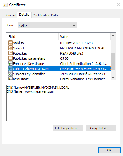This example creates a self-signed certificate that uses MYSERVER.MYDOMAIN.LOCAL in the Issuer, Subject, and Subject Alternative Name fields in the certificate, but also adds www.myserver.com to the Subject Alternative Name field.